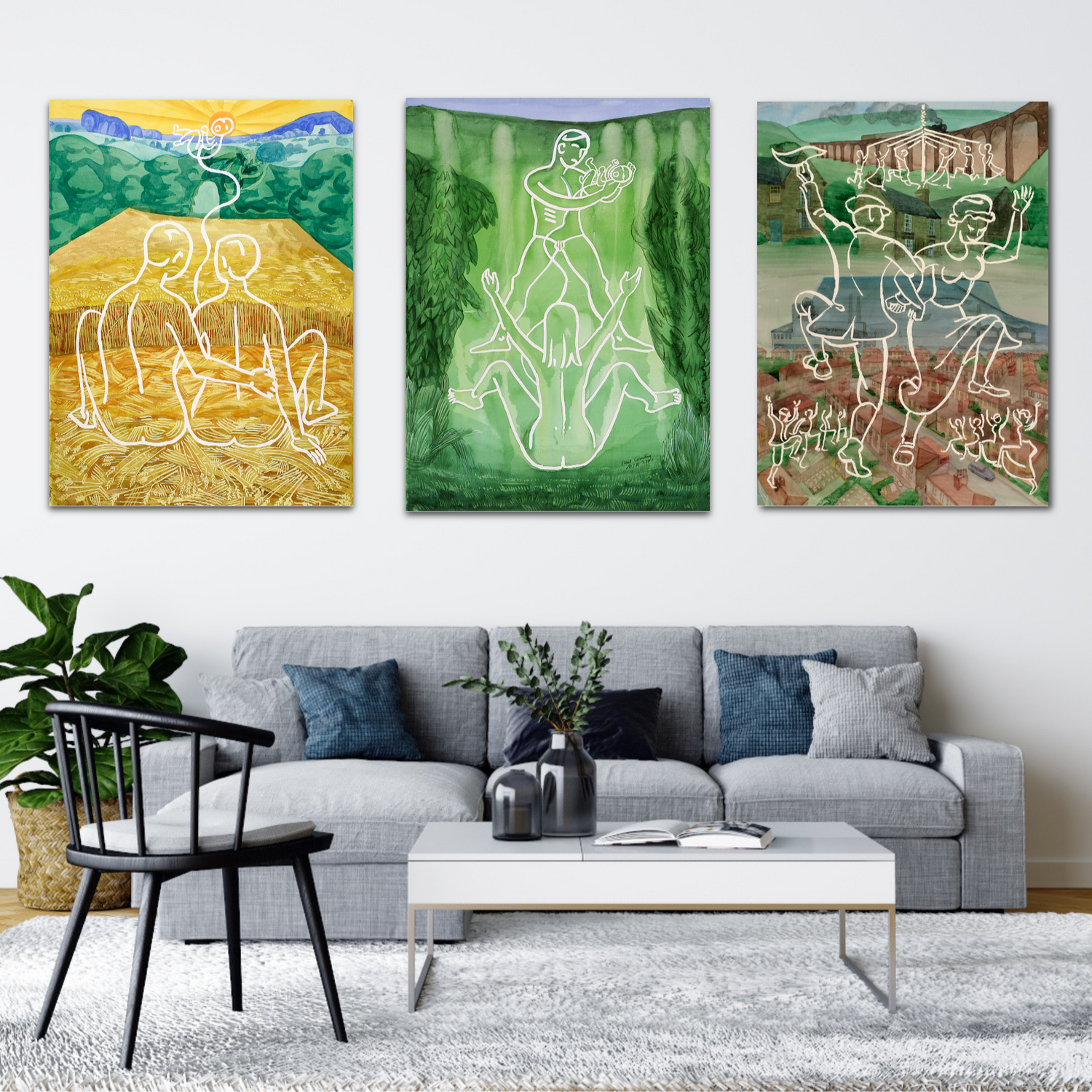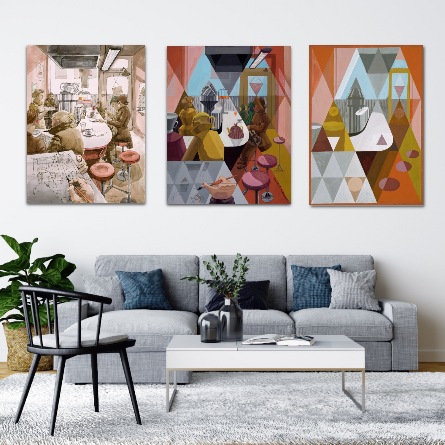 In these sets of works, an image is developed across various categories. Starting with a representational scene, the artist then goes on to make various geometric reductions until the set ends in abstract geometry.